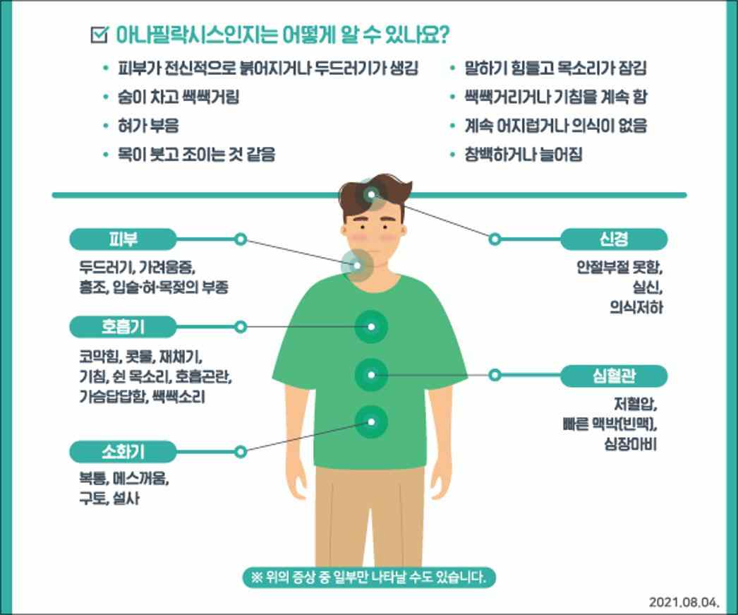 아나필락시스 - 전문용어로는 항원, 항체 면역 반응이 원인이 되어 발생하는 급격한 전신 반응이라고 되어 있는데 좀 말이 어렵네요. 간단하게 말하면 알레르기 증상이 심하게 오는 증상을 말한다고 하면 될 것 같습니다. 일반적으로 어떤 음식이나 약물이 우리 몸에 들어왔을 때 갑자기 숨을 쉬기 힘들거나 혈압이 떨어지고 정신을 잃는 등의 심각한 알레르기 증상이 나타나는 것을 말합니다.